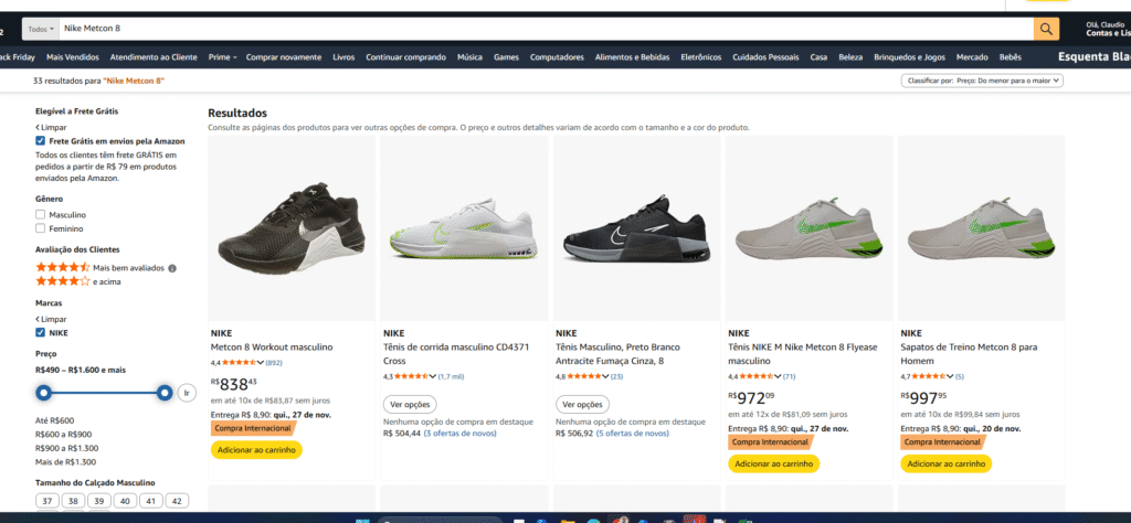Reconhecido por sua estabilidade e suporte durante levantamentos pesados, o Nike Metcon 8 é uma escolha popular entre os praticantes de musculação. Com um preço médio de R$ 749, o modelo é ideal para crossfit e treinos de alta intensidade. Os prós incluem a ótima aderência e a estrutura reforçada, enquanto os contras podem ser a rigidez inicial que alguns usuários relatam.